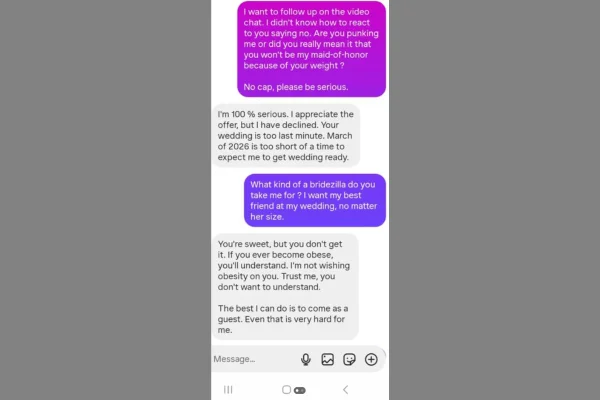 “Fiquei tão atordoada que tudo o que consegui dizer foi: ‘Ok’”, lembrou a noiva. Após o momento, ela pediu uma explicação sobre o verdadeiro motivo da amiga se recusar a ser sua madrinha de casamento. “Você está brincando comigo ou realmente disse que não será minha madrinha por causa do seu peso?”.