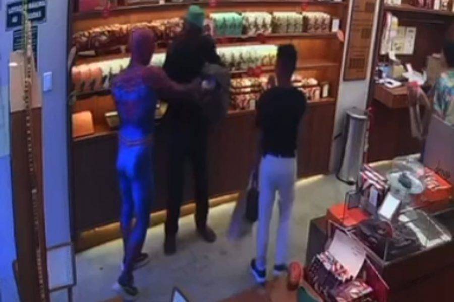 Nas imagens, é possível ver o momento em que um homem em situação de rua entra na loja e pega uma caixa de chocolates, ignorando os pedidos dos funcionários para devolver o produto. Poucos segundos depois, o “Homem-Aranha” aparece, recupera a mercadoria e coloca o suspeito para fora.