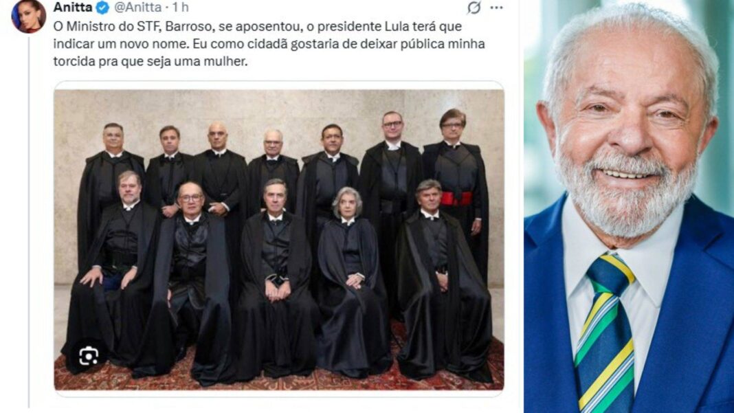 A cantora Anitta usou suas redes sociais para fazer um apelo direto ao presidente Luiz Inácio Lula da Silva (PT). Ela pediu que o chefe do Executivo indique uma mulher para ocupar a vaga deixada pelo ministro Luís Roberto Barroso no Supremo Tribunal Federal (STF).