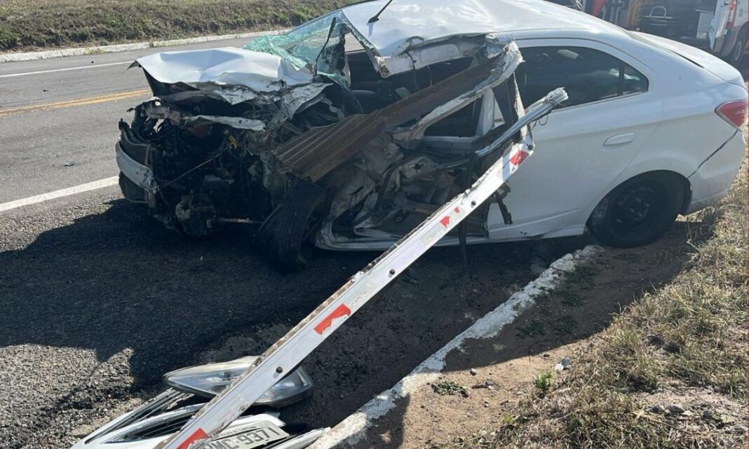 A frente do sege ficou destruída em seguida atingir a lateral do caminhão, que tombou e saiu da estrada, parando em uma extensão de vegetação.