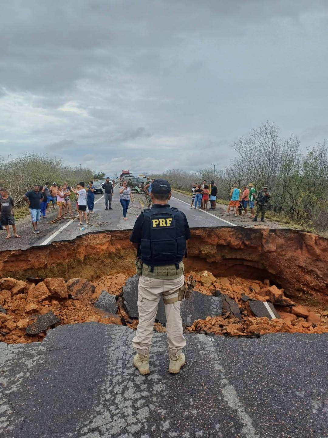 As fortes chuvas que atingem a região da Bahia provocaram uma erosão que abriu uma grande cratera no km 290 da BR-116, em Tucano (BA), resultando na interdição total da rodovia.