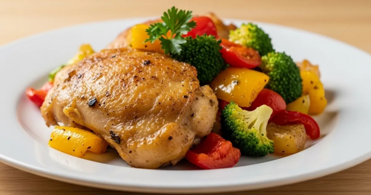 Frango acebolado rápido com legumes na frigideira