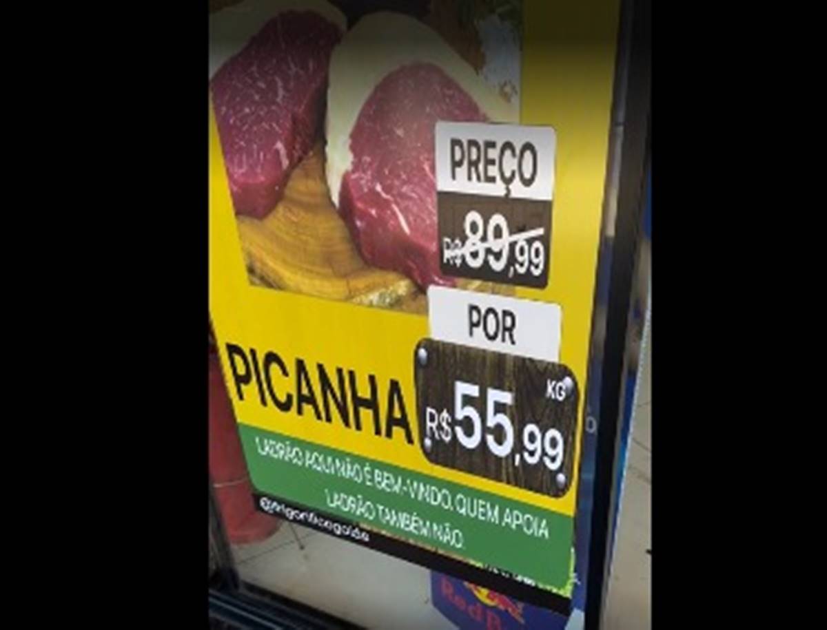 Goiânia – Após a decisão judicial que obrigou a retirada do cartaz “petista não é bem-vindo” de uma loja do frigorífico Goiás, na capital goiana, o CEO do estabelecimento Leandro Batista fez um novo anúncio. Em vídeo publicado nas redes sociais, nessa terça-feira (30/9), o empresário mostrou que trocou a frase por: “Ladrão aqui não é bem-vindo. Quem apoia ladrão também não”.