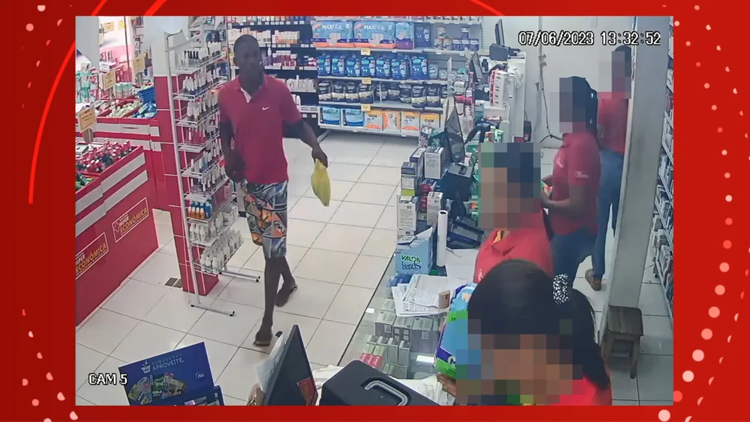 Caso aconteceu na cidade de Candeias, na Região Metropolitana de Salvador, na tarde de quarta-feira (7). Câmera de segurança flagra assalto a um uma farmácia em Candeias, na Bahia Um homem foi flagrado por uma câmera de vigilância ao invadir e assaltar uma farmácia na cidade de Candeias, na Região Metropolitana de Salvador, na tarde de quarta-feira (7). Até a manhã desta quinta-feira (8), o suspeito ainda não havia sido preso. As imagens mostram o momento em que o homem, sem cobrir o rosto, entra no estabelecimento que funciona dentro de um hipermercado. Ele aborda as funcionárias da farmácia, que estão trabalhando no caixa, e pega o dinheiro. Uma das mulher, inclusive, está guardando cédulas em uma caixa. Homem é flagrado por câmera de vigilância ao invadir e assaltar farmácia na Bahia Reprodução/TV Bahia Sem mostrar um armamento, ele faz menção de ter algo escondido na cintura. O homem pega moedas e cédulas e sai do estabelecimento andando tranquilamente. Ainda na gravação é possível ver que as funcionárias ficaram assustadas. A Polícia Militar foi acionada e chegou a ir até o local, mas não encontrou o suspeito. Ainda não há informações se o assalto foi registrado em uma delegacia.