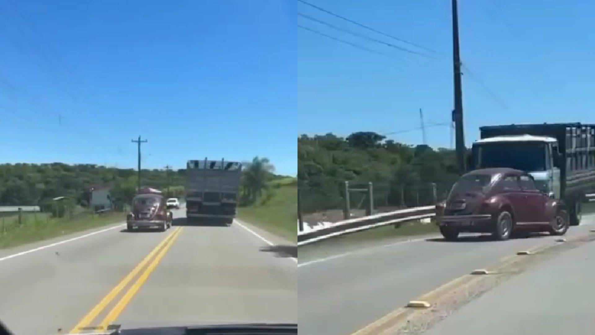 Nas imagens, é possível ver o Fusca invadindo a pista contrária em uma tentativa de ultrapassagem em local proibido, sinalizado por faixa contínua. O vídeo mostra ainda que o carro quase colidiu de frente com outros veículos antes de bater violentamente contra o caminhão. O impacto foi tão forte que o veículo ficou completamente destruído.
