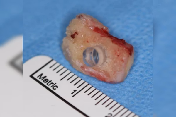 - O dente com a lente é colocado temporariamente sob a pele da bochecha do paciente. Ali, ele fica envolto por tecido conjuntivo, o que ajuda a criar uma camada de proteção biológica.