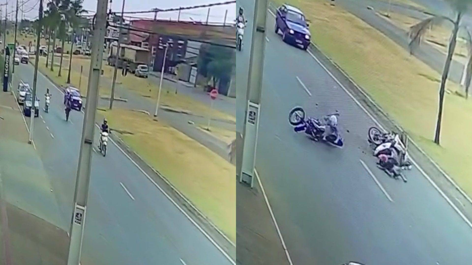 Um motociclista que estava empinando a moto provocou um acidente e fugiu sem prestar socorro. O caso aconteceu na Avenida André Maggi, em Sinop, Mato Grosso, quando câmeras de segurança registraram a colisão entre duas motocicletas.
