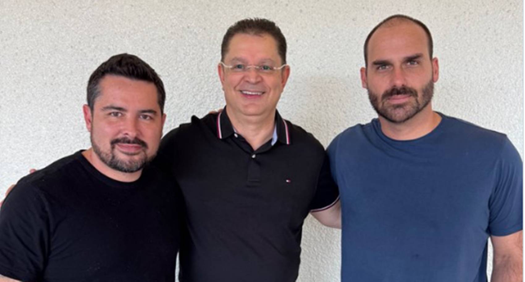 O líder do PL na Câmara, Sóstenes Cavalcante (RJ, ao centro na imagem), encontrou-se nesta quinta-feira (25/9) com o deputado federal Eduardo Bolsonaro (PL) e o blogueiro Paulo Figueiredo nos Estados Unidos.