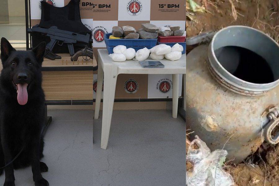 A equipe chegou ao local, no bairro Jorge Amado, após receber uma denúncia. Com a ajuda de um cão farejador, os agentes localizaram o material escondido. Foram encontradas uma submetralhadora, dois revólveres, uma escopeta, além de 10 kg de maconha, 4 kg de cocaína, um colete balístico, uma balança de precisão e munições.