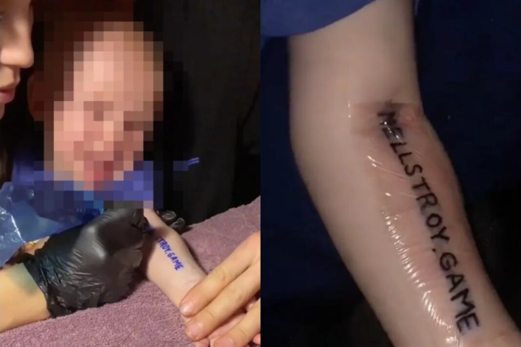 Imagens que circulam na internet mostram um bebê de 1 ano sendo segurado pelo pai enquanto uma tatuadora pinta a palavra “Mellstroy-Game” em seu braço. Os genitores alegaram que estavam participando de uma competição on-line para ganhar um apartamento grátis.