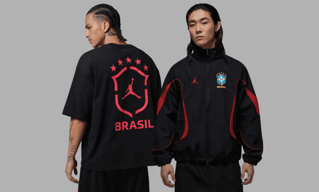 As imagens vazadas revelam uma coleção predominantemente preta com detalhes em vermelho, seguindo a cartela de cores clássica da Jordan Brand. Entre as peças mais chamativas está uma jaqueta com recortes vermelhos nas laterais, trazendo a escrita Brasil nas costas em letras brancas acompanhadas do clássico Jumpman vermelho.
