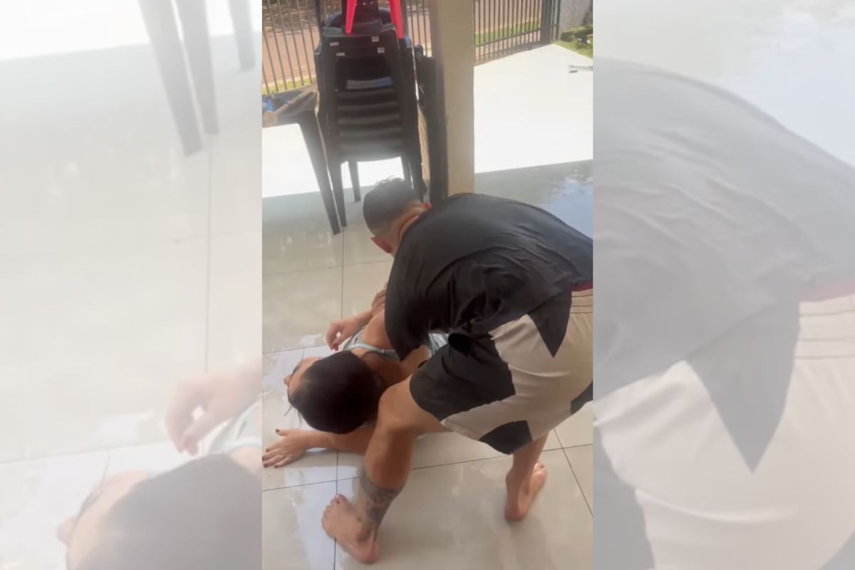 - No vídeo, o genro, Matheus, aparece escorregando no chão enquanto lava a garagem e o quintal ao lado da sogra, Lucien.