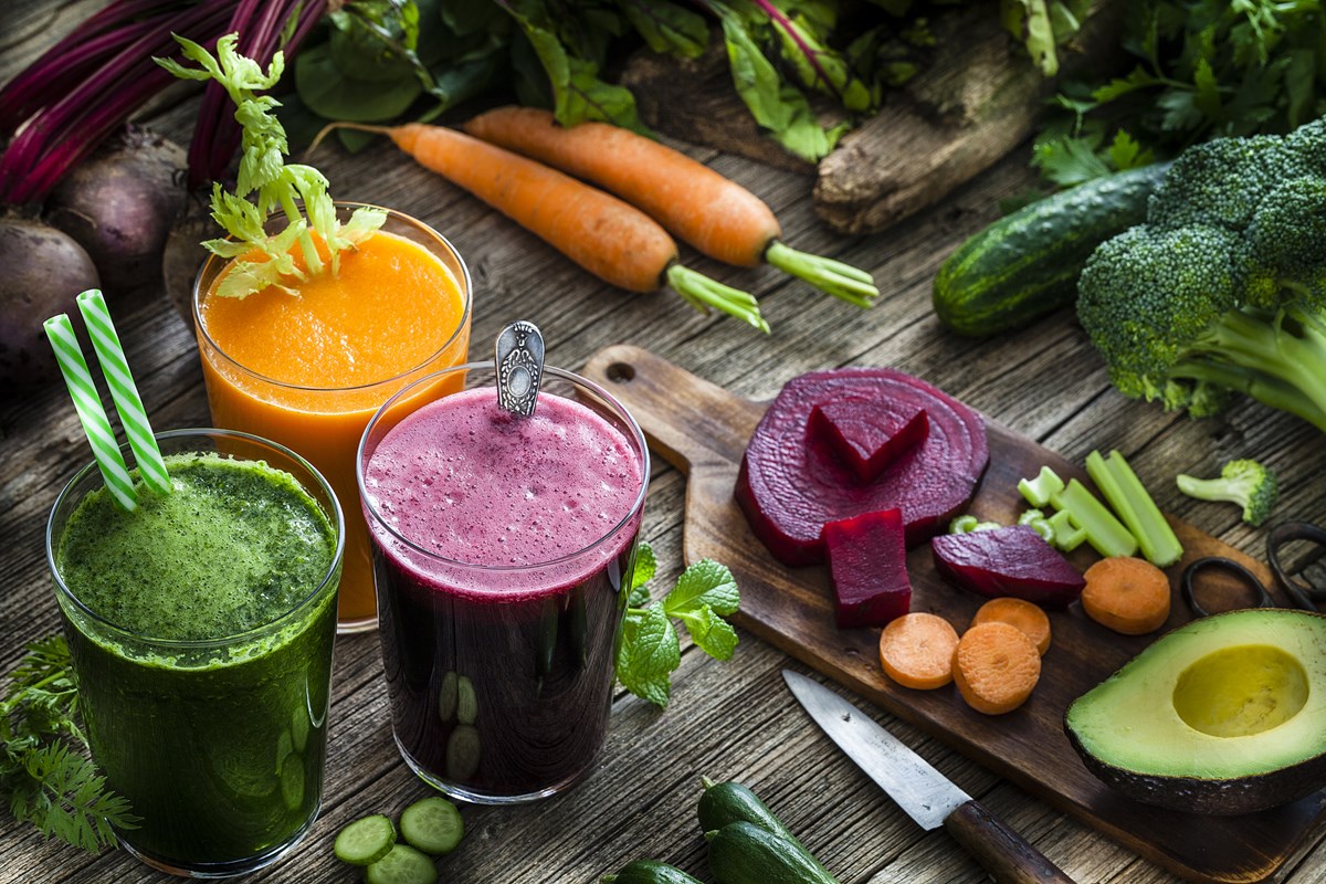 Bebidas vegetais: vista de alto ângulo de três copos cheios de suco de beterraba, cenoura e vegetais verdes, filmados na mesa da cozinha de madeira rústica. Legumes como beterraba, cenoura, pepino, brócolis, abacate e aipo estão por toda parte nos copos de suco. As cores predominantes são roxo, verde e laranja. Foto discreta de estúdio DSRL tirada com Canon EOS 5D Mk II e Canon EF 100mm f/2.8L Macro IS USM. - Suco para a imunidadeO suco de beterraba com cenoura pode ser consumido como pré-treino