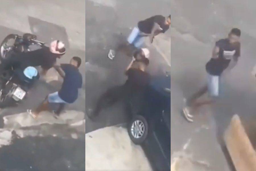 Nas imagens, o suspeito aborda um motociclista, que reage e entra em luta corporal com ele. Durante a briga, o criminoso dispara, mas o tiro não atinge a vítima. Em seguida, ele aponta a arma novamente, ameaça, mas foge sem atirar.