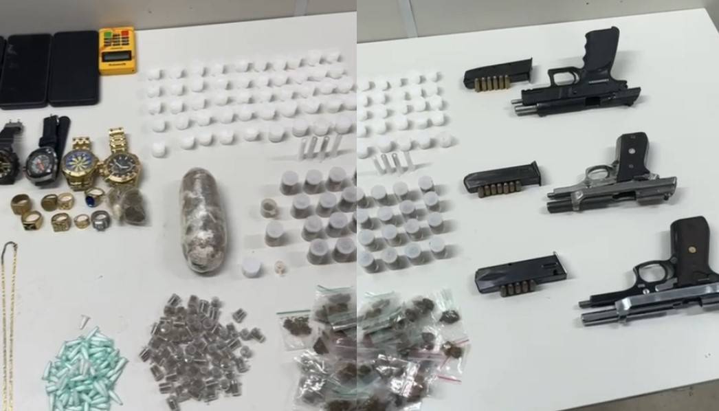 Durante a operação, a polícia confiscou três pistolas, 139 porções de maconha, um rolo de haxixe, 104 porções de cocaína, uma porção de crack, além de cinco relógios, oito anéis, duas correntes, três celulares e uma máquina de cartão.