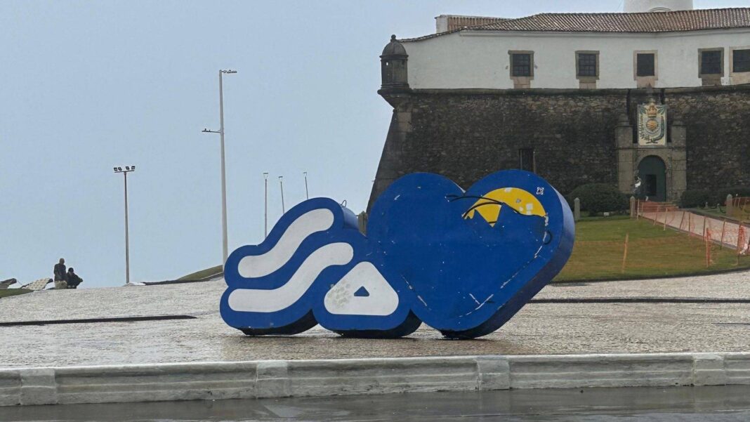 Uma placa instalada em frente ao Farol da Barra, um dos cartões-postais mais famosos de Salvador, ameaça cair devido aos ventos fortes que atingem a capital baiana nesta sexta-feira (13). A situação chama a atenção de moradores e turistas que circulam pela região, já que o local costuma atrair grande movimentação, especialmente aos finais de semana.