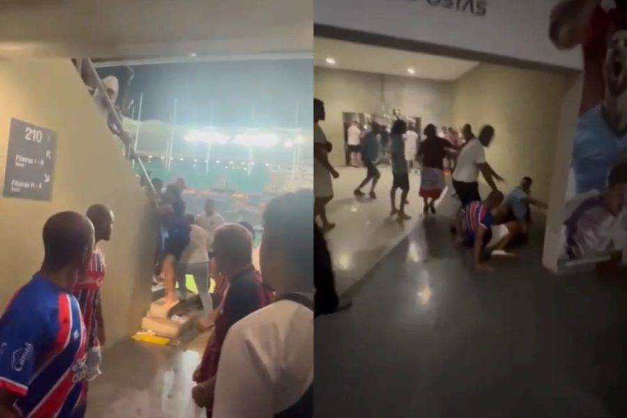 A noite da última segunda-feira (15) foi marcada por uma briga generalizada entre torcedores do Bahia na Arena Fonte Nova. A confusão, que aconteceu na área de bares do terceiro anel do estádio, foi registrada em vídeo e mostra dezenas de pessoas trocando socos e empurrões.